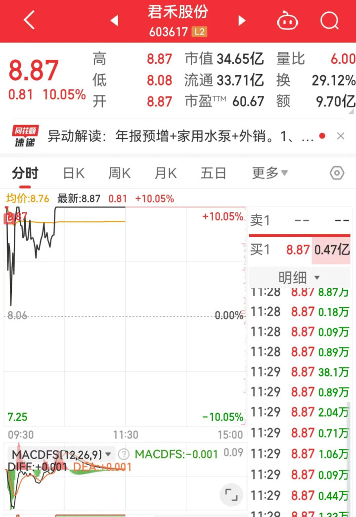 1、临盘竞价顶了君禾股份,昨天的爆量回封,早盘竞价一字板沿路加单,奴隶顶了一笔,开盘被炸进去,这个票当今是年报预增的身位板,今天早盘砸的很凶,好在后头回封了,望望未来能不可转强;